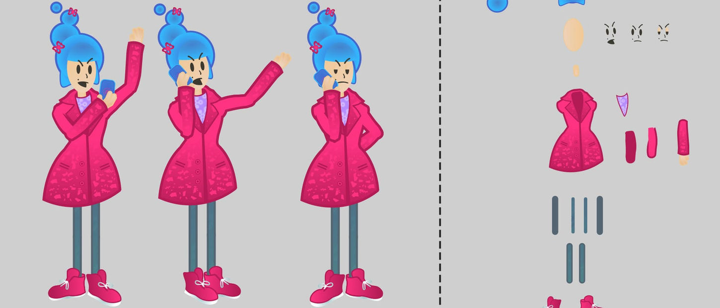 To do this, each joint has up to four layers with a foreground the matches and a background that matches. When they move over the layer below, it gives the impression the shape is blended and moving without making the edge visible while moving. All of the hands, arms, legs, shoes, and items the characters are holding, were modular and interchangeable in order to assemble them based on the page content.